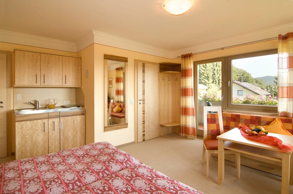 Unser mit edlen Holzvarianten stilvoll gestaltetes Appartement mit harmonischen Farben bietet ein Ambiente besonderen Wohlgefühls. Der geräumige Wohn-/Schlafraum ist mit DU/WC, Miniküche, Couch, TV/Radio, Telefon, W-Lan, Safe, etc. eingerichtet. Erfreuen Sie sich auf dem großen Balkon am herrlichen Ausblick über Bodenmais und seine schöne Landschaft. Mit und ohne Frühstücksbuffet und Zimmerservice buchbar.